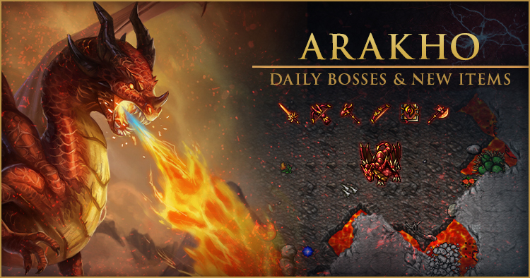 Quando o Arakho chegar aos 75% de vida a sala inteira ficará com Fire Fields roxos, menos 4 lugares que neles os jogadores ficarão seguros. Caso os jogadores não fiquem nos lugares seguros, os Fire Fields roxos darão 1.000 de dano e será sumonado 2 Dragon Lords. Quando o Arakho chegar aos 50% de vida o processo se repete, porém será sumonado 4 Dragon Lords inevitavelmente. Quando o Arakho chegar aos 25% de vida se tornará invulnerável, surgirão 4 pedras nos lugares seguros e um "Machado Dourado" na esquerda da sala, que só pode ser empurrado, não transportado. Os jogadores devem bater três vezes em cada pedra com o "Machado Dourado" para quebrá-las. Atencão! Quando o jogador bater o machado na pedra, serão sumonados diferentes monstros. Os jogadores terão 5 minutos para fazerem esse processo, quem ficar fora dos lugares seguros irá morrer. Se os jogadores quebrarem as pedras antes dos 5 minutos, a sala inteira ficará com fogo roxo e os jogadores tem 20 segundos para ir para os lugares seguros. Depois disso o boss voltara a ser vulnerável! Perfected: Caso os jogadores não fiquem nos lugares seguros, o jogador irá morrer ao invés de tomar 1.000 de dano. Ao quebrar as pedras, irão aparecer mais monstros. When Arakho reaches 75% health, the entire room will be covered in purple Fire Fields, except for 4 places where players will be safe. If players do not stay in the safe places, the purple Fire Fields will deal 1.000 damage and 2 Dragon Lords will be summoned. When Arakho reaches 50% health, the process repeats itself, but 4 Dragon Lords will inevitably be summoned. When Arakho reaches 25% health, he will become invulnerable. 4 rocks will appear in the safe places and a "Golden Axe" will appear on the left side of the room, which can only be pushed, not carried. Players must hit each rock three times with the "Golden Axe" to break them. Attention! When the player hits the axe on the rock, different monsters will be summoned. Players will have 5 minutes to do this process. Anyone who stays outside the safe places will die. If players break the rocks before the 5 minutes are up, the entire room will be lit up in purple fire and players will have 20 seconds to get to safe places. After that, the boss will be vulnerable again! Perfected: If players do not stay in the safe places, they will die instead of only getting a 1.000 damage. When breaking the stones, more monsters will spawn. |